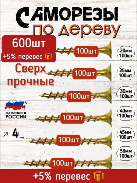 Саморез по дереву 20мм -100 шт Саморез по дереву 25мм -100 шт Саморез по дереву 35мм -100 шт Саморез по дереву 40мм -100 шт Саморез по дереву 45мм -100 шт Саморез по дереву 50мм -100 шт