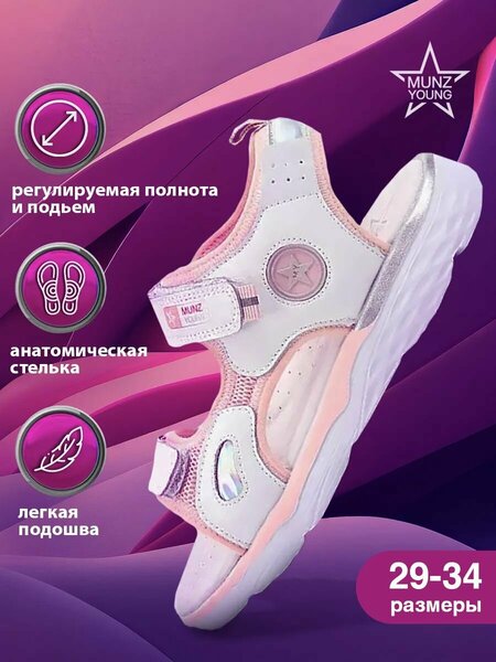 Сандалии для девочки и подростковые летние текстильные и экокожа на платформе 1.8 см с высотой под пяткой 2,3 см на липучках выполнены в спортивном стиле. Эта детская и женская летняя обувь с ремешками изготовлена с круглым носом. Тканевые сандалии на высокой подошве без каблука предназначены для повседневной носки, активного отдыха, прогулок и игр. Красивые сандалии для города и дачи могут пригодиться как медицинские тапочки и сменная обувь для работы и в школу. Такая открытая подростковая обувь на толстой подошве удобная и устойчивая, комфортна для взрослых женщин, девочек подростков. Легкие открытые туфли на липучке комфортны в течение всего дня как тапочки. Подходят женские сандалии на танкетке как сменка, для туризма. Мягкие туфли на плоской подошве пригодятся для моря и пляжа как шлепки. Женские или детские сандалии без каблука выглядят модно, идут под платье, юбку, шорты. Модные уличные или домашние туфли на лето для женщины и девушек легко заменяют босоножки для танцев, шлепанцы на море. Спортивные сандалии могут подойти для путешествия и приключений. Брендовые розовые сандалии на белой подошве дополнены качественной фурнитурой. Изготовлены стильные сандалии из текстиля розового цвета, 55 процентов. Кожаные вставки из мягкой искусственной кожи, 45 процентов. Подкладка из текстиля розового цвета. Стелька из натуральной кожи белого цвета. Облегченная подошва Munz Light из экологичного ЭВА упругая, с отличными противоскользящими свойствами. Эта модель Мюнц Янг полноты 5 комфортна на широкую ногу, полную и средней обычной полноты на вырост. Вес пары около 510 гр. Размерную сетку см. в фотографиях.