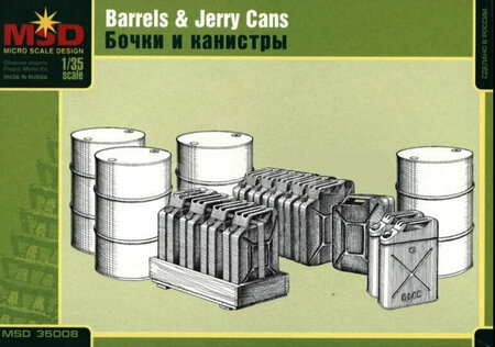 В коробке - набор пластиковых бочек и канистр в масштабе 1/35.
