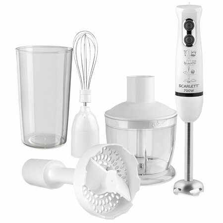 Погружной блендер SCARLETT SC-HB42M33/M41 многофункционален и прост в обращении. Он поможет вам быстро и качественно приготовить множество самых разнообразных и сложных блюд – супов, пюре, рагу, запеканок, салатов, коктейлей. В наборе венчик для взбивания, мини-измельчитель и даже специальная насадка для приготовления картофельного пюре. Точно соблюдать пропорции при приготовлении вам поможет мерный стакан на 0,6л. Мотор оптимальной мощностью 700Вт обеспечивает прибору стабильную работу и длительный срок эксплуатации. Вы можете выбрать 1-ю скорость для мягких и жидких ингредиентов и 2-ю скорость – для твердых ингредиентов, таких как орехи или твердый сыр. Все погружные части и ножи блендера выполнены из долговечной нержавеющей стали марки STEEL PRO, которая отлично подходит для приготовления блюд любой температуры. Классический белый цвет прибора подчеркнут элегантными черными и хромовыми декоративными элементами.