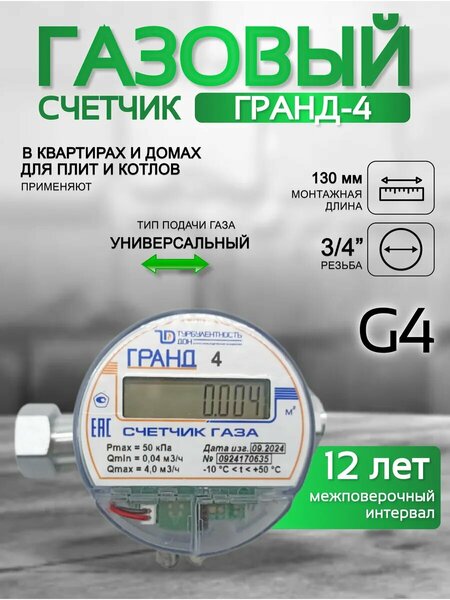 Счетчик газа гранд 4 3\4 Б\К 130 мм - это надежный и точный прибор для учета потребления газа в бытовых условиях. Одной из ключевых особенностей счетчика является струйный метод учета, который исключает использование движущихся механических частей и обеспечивает высокую надежность. Это обусловлено струйным методом учета объема потребления газа. Счетчик гранд 4 3\4 обладает энергонезависимой памятью, что позволяет сохранять данные даже при отключении питания. Это обеспечивает удобство использования и позволяет избежать ошибок при передаче данных. Счетчик имеет компактные размеры и массу, что делает его удобным для монтажа. Монтаж можно произвести в любом удобном для клиента положении, в вертикальном или горизонтальном. Счетчик гранд 4 3\4 имеет длительный срок гарантии - 1 год. Максимальный расход счетчика составляет 4 м3/ч, а минимальный - 0.04 м3/ч. Максимальное избыточное давление - 5.0 бар. Межповерочный интервал составляет 12 лет. Таким образом, счетчик газа гранд 4 3\4 Б\К 130 мм является надежным и удобным решением для учета потребления газа в бытовых условиях.