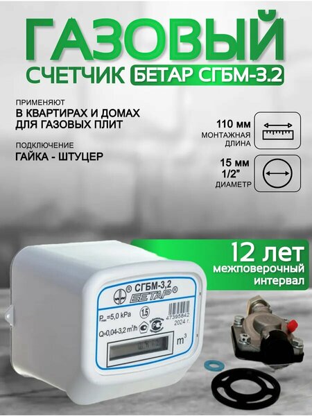 Счетчик газа бетар сгбм 3.2 м3 гайка штуцер Счетчик газа бетар сгбм 3.2 предназначен для точного измерения и контроля объема потребляемого количества природного газа по ГОСТ 5542-87 или паров сжиженного углеводородного газа по ГОСТ 20448-90, используемых в бытовых и производственных целях. Счетчики газа сгбм 3.2 - это струйно-акустические приборы, разработанные специально для бытового использования. Они предназначены для измерения расхода природного газа в домашних условиях. Данный бытовой счетчик газа предназначен для использования в доме, в квартире, для газовых плит и газовых колонок. Основные характеристики счетчиков газа сгбм 3.2: