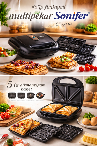 Sonifer SF-6114 отлично подходит для кухни, кафе, дачи или в подарок. Он заменяет несколько приборов — вафельницу, гриль, омлетницу и классическую сэндвичницу — что экономит место и бюджет.