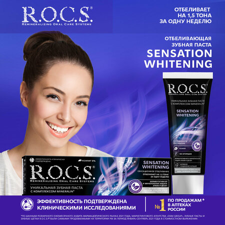 Зубная паста R.O.C.S. Сенсационное отбеливание предназначена для комплексного ухода за полостью рта. Объем тюбика составляет 60 мл. Эта паста помогает вернуть природную белизну зубов и дарит им восхитительный блеск.