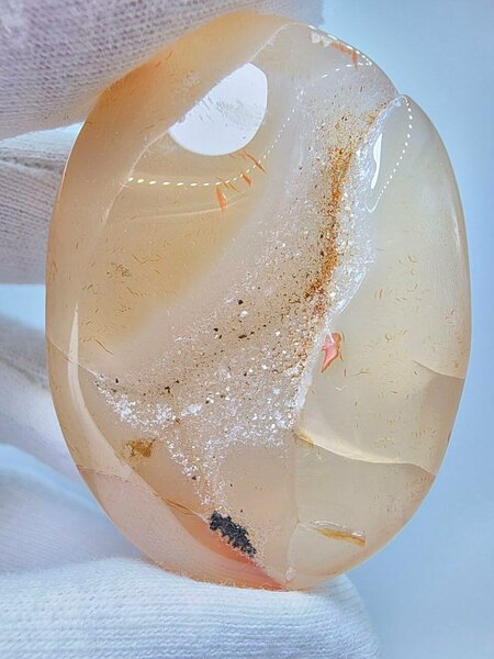 Булька из сердолика с жеодой кварца. Размер 51х36х18 мм. Вес 48 г. Сердолик – это разновидность халцедона, имеющая окраску от золотисто-желтого до оранжево-красного цвета. Является ценным ювелирно-поделочным камнем. Разновидности: Сардер – густоокрашенный с преобладающим каштаново-бурым оттенком, Карнеол – насыщенно-красный, Сардоникс (сердоликовый оникс) – камень с чередующимися слоями ярко-красной или красно-желтой и молочно-белой окрасок. Характеристики: Твёрдость по шкале Мооса: 6,5 условных единиц. Плотность: 2,6 г/см. Окраска обусловлена примесями природных оксидов и гидроксидов железа. Встречается как однородная, так и зональная окраска (концентрически-зональная, реже плоскопараллельно-зональная). Происхождение и месторождения: обычно заполняет трещины и миндалины в эффузивных породах. Накапливается в виде гальки в корах выветривания и россыпях. Главные промышленные месторождения находятся в: Индии (Деканское плоскогорье), Бразилии (штат Минас-Жерайс), Уругвае, России (Восточная Сибирь, Дальний Восток, Чукотка). Используется для изготовления бус и украшений, вставок в кольца и броши. Сардоникс применяется в глиптике. В древности из сердолика изготавливали цилиндрические и круглые печати. Фигурки скарабеев. Амулеты. Особенно ценятся однородные, неяснополосчатые полупрозрачные или просвечивающие камни ярко-красного и оранжевого цвета. В Древнем Египте сердолик высоко ценился и использовался для создания различных ритуальных предметов, включая амулеты и украшения для фараонов. Сердолик считается одним из самых мощных любовных камней. В древности его называли “камнем богини Изиды” и “камнем, в котором застыл закат солнца”. Основные магические свойства: Способствует возникновению устойчивых чувств. Защищает от любовных чар. Олицетворяет семейное счастье. Помогает найти родственную душу. Развивает интуицию. Усиливает проницательность. Способствует духовному очищению. Направляет жизненные силы в нужное русло. Оберегает от тёмной магии. Помогает в принятии важных решений. Влияние на знаки зодиака: Подходит: знакам земной и водной стихии, особенно благоприятен для: Тельцов (помогает найти любовь), Раков (развивает интуицию), Козерогов (придаёт уверенность). Не рекомендуется Скорпионам. Древние славяне называли сердолик “каднос” или “смазень”. Считалось, что амулет с этим минералом защищает саму суть человеческой жизни. Важные рекомендации: Наибольшую силу камень проявляет в качестве подарка. Очищать камень рекомендуется слабым мыльным раствором. Хранить следует отдельно от других камней. Сердолик считается одним из самых благоприятных камней для создания гармоничных отношений и достижения жизненного успеха. Его энергия помогает своему владельцу раскрыть лучшие качества и достичь поставленных целей. Камень натуральный, поэтому может иметь естественные трещинки, включения, неровности поверхности, рисунка, цвета, что подтверждает и подчеркивает его природное происхождение. Цвет на фото может несколько отличаться от цвета в реальности за счет разных настроек мониторов и особенностей освещения при фотографировании. Вы приобретаете именно тот образец, что на фотографии.