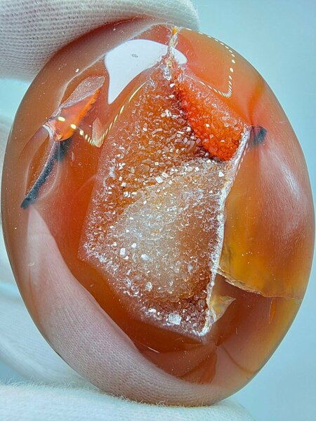 Булька из сердолика с жеодой кварца. Размер 55х44х22 мм. Вес 70 г. Сердолик – это разновидность халцедона, имеющая окраску от золотисто-желтого до оранжево-красного цвета. Является ценным ювелирно-поделочным камнем. Разновидности: Сардер – густоокрашенный с преобладающим каштаново-бурым оттенком, Карнеол – насыщенно-красный, Сардоникс (сердоликовый оникс) – камень с чередующимися слоями ярко-красной или красно-желтой и молочно-белой окрасок. Характеристики: Твёрдость по шкале Мооса: 6,5 условных единиц. Плотность: 2,6 г/см. Окраска обусловлена примесями природных оксидов и гидроксидов железа. Встречается как однородная, так и зональная окраска (концентрически-зональная, реже плоскопараллельно-зональная). Происхождение и месторождения: обычно заполняет трещины и миндалины в эффузивных породах. Накапливается в виде гальки в корах выветривания и россыпях. Главные промышленные месторождения находятся в: Индии (Деканское плоскогорье), Бразилии (штат Минас-Жерайс), Уругвае, России (Восточная Сибирь, Дальний Восток, Чукотка). Используется для изготовления бус и украшений, вставок в кольца и броши. Сардоникс применяется в глиптике. В древности из сердолика изготавливали цилиндрические и круглые печати. Фигурки скарабеев. Амулеты. Особенно ценятся однородные, неяснополосчатые полупрозрачные или просвечивающие камни ярко-красного и оранжевого цвета. В Древнем Египте сердолик высоко ценился и использовался для создания различных ритуальных предметов, включая амулеты и украшения для фараонов. Сердолик считается одним из самых мощных любовных камней. В древности его называли “камнем богини Изиды” и “камнем, в котором застыл закат солнца”. Основные магические свойства: Способствует возникновению устойчивых чувств. Защищает от любовных чар. Олицетворяет семейное счастье. Помогает найти родственную душу. Развивает интуицию. Усиливает проницательность. Способствует духовному очищению. Направляет жизненные силы в нужное русло. Оберегает от тёмной магии. Помогает в принятии важных решений. Влияние на знаки зодиака: Подходит: знакам земной и водной стихии, особенно благоприятен для: Тельцов (помогает найти любовь), Раков (развивает интуицию), Козерогов (придаёт уверенность). Не рекомендуется Скорпионам. Древние славяне называли сердолик “каднос” или “смазень”. Считалось, что амулет с этим минералом защищает саму суть человеческой жизни. Важные рекомендации: Наибольшую силу камень проявляет в качестве подарка. Очищать камень рекомендуется слабым мыльным раствором. Хранить следует отдельно от других камней. Сердолик считается одним из самых благоприятных камней для создания гармоничных отношений и достижения жизненного успеха. Его энергия помогает своему владельцу раскрыть лучшие качества и достичь поставленных целей. Камень натуральный, поэтому может иметь естественные трещинки, включения, неровности поверхности, рисунка, цвета, что подтверждает и подчеркивает его природное происхождение. Цвет на фото может несколько отличаться от цвета в реальности за счет разных настроек мониторов и особенностей освещения при фотографировании. Вы приобретаете именно тот образец, что на фотографии.