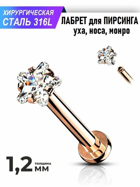 Лабрет из хирургической стали для пирсинга уха, крыла носа, губ (пирсинг Мадонна, Монро, Медуза). Серьга с внутренней резьбой, инкрустирована кубическим цирконом в форме звездочки. Длина штанги: 6 или 8 мм. Толщина: 1.2 мм. Размер камня: 3 мм. Лабрет из стали для украшения прокола под нижней или верхней губой (пирсинг Мадонна, Монро, Медуза), либо для пирсинга ушного хряща. Имеет золотое IP-покрытие - это ионное напыление микрочастиц, которые встраиваются в металл, вследствие чего изделие получает необходимый цвет. Как показывает практика, технология IP - покрытия является самой надежной и прочной в ювелирной промышленности на сегодняшний день и делают поверхность изделий в 5-8 раз более прочной и износостойкой, чем при традиционном нанесении покрытия. Spikes использует в изготовлении бижутерии высококачественную прецизионную сталь 316L с повышенными характеристиками: прочность и высокая стойкость к воздействию коррозии. Ручная обработка: зашлифованные кромки и тщательно отполированная поверхность. Материал: нержавеющая сталь премиального качества. Пирсинг из медицинской стали безопасен для здоровья, его можно носить не только в уже заживших проколах, но и использовать для первичного пирсинга. Сталь не окисляется при контакте с кожей и не вызывает раздражений. Стальные бижутерные изделия пирсинг без покрытия не меняют оттенок со временем и идеально подходят для ежедневного ношения. Накрутка лабрета закручивается по часовой стрелке, откручивается - против часовой стрелки. Эта лабретка с внутренней резьбой станет настоящей изюминкой любого пирсинга. Изготовлен из высококачественной хирургической стали 316L, он не только обеспечивает высочайшую прочность, но и превосходную совместимость с кожей. Плоский круглый базовый элемент обеспечивает комфортное ношение, не мешая. Камень из циркония в форме звезды прозрачного цвета, придает украшению привлекательный блеск. Испытайте идеальное сочетание стиля и комфорта и побалуйте себя этим сверкающим зрелищем!