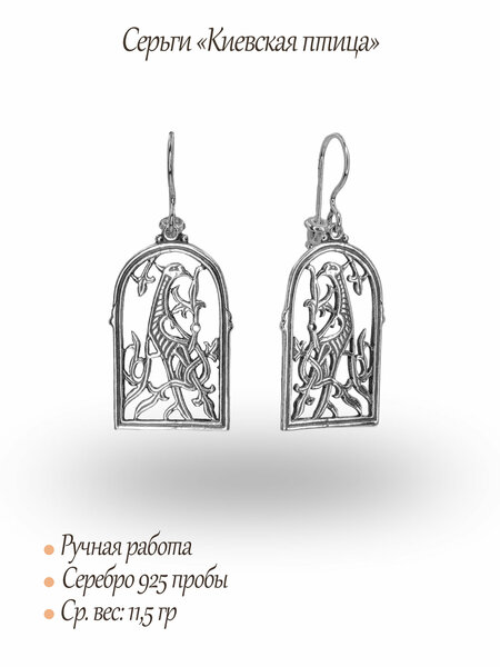 Размер: M (H 34 мм, L 21 мм) Ср. вес: 11,5 гр. Серьги с мирными птицами – символами души. Птицы – пожелание мира, покоя, благополучия. Мирные птицы на серьгах - пожелание процветания, спокойной и благополучной жизни. Птицы с древних пор у многих народов символизируют женщин, души, мирную жизнь в благополучии и покое. Этот узор является благопожеланием женщине такой светлой жизни. Узел заплетённый из хвоста птицы – конечен. Его предназначение отражено в его названии– бедоотвод. Серьги созданы по мотивам Серьгиа из клада 1893 г, найденного в Киеве, на углу улиц Сретенская и Малая Владимирская.