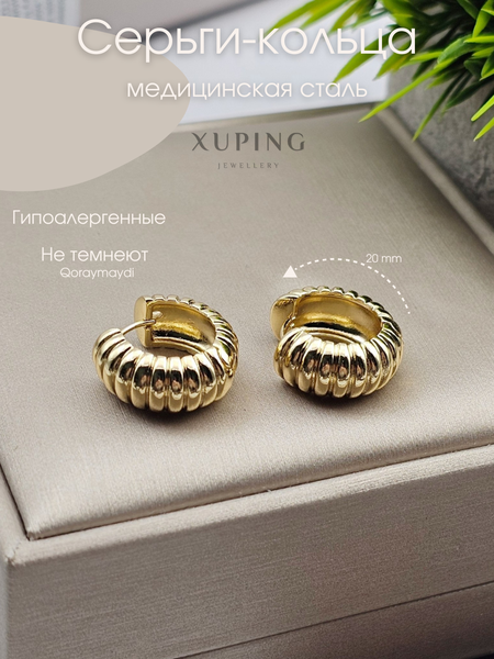 Серьги-кольца Xuping: элегантность, стиль и комфорт Эти крупные серьги-кольца от Xuping — отличный выбор для стильных дам, которые ценят качество и универсальность в украшениях. Великолепное сочетание изысканного дизайна и практичности делает их подходящими для любого события: от деловых встреч до вечерних выходов и повседневных образов. Особенности: Изготовлены из высококачественной медицинской стали с позолоченным покрытием, что гарантирует долговечность и устойчивость к внешним воздействиям. Гипоаллергенные и не вызывают раздражений, что делает их комфортными даже для самой чувствительной кожи. Позолоченное покрытие не темнеет и сохраняет свой блеск и насыщенность цвета на протяжении долгого времени. Серьги-кольца Xuping — это не просто украшение, а настоящий акцент в вашем образе, который подчеркнет вашу индивидуальность и элегантность в любой ситуации.