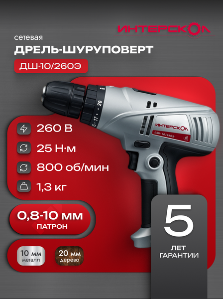 Сетевая дрель-шуруповерт. Выполняет весь ассортимент шуруповертных и сверлильных работ - заменяет аккумуляторные аналоги, при условии доступности электропитания. Преимущества: муфта ограничения момента позволяет выставить требуемое предельное усилие заворачивания крепежа; плавная электронная регулировка оборотов; легкий и мощный электродвигатель; незаменима при выполнении серийных операций; всегда готова к работе – не нужно следить за аккумулятором. Спецификация: Параметры сети питания, В/Гц: 220 ±10% / 50 Номинальная потребляемая мощность, Вт: 260 Диапазон частоты вращения на холостом ходу, об/мин: 0-800 Номинальный крутящий момент , Нм: 25 Диаметр зажимаемого сверла, мм: 0,8-10 Кол-во диапазонов момента затяжки: 20+1 Наибольший диаметр сверления в стали, мм: 10 Наибольший диаметр сверления в древесине, мм: 20 Наибольший диаметр завинчиваемых шурупов, мм: 6 Длина шнура питания с вилкой, м, не менее: 2 Смена направления вращения: есть Регулировка оборотов: есть Быстрозажимной патрон: есть Тип редуктора: 1-о скоростной Класс безопасности машины(по ГОСТ Р МЭК 60745-1): II Комплектация: Машина сверлильная 1шт. Руководство по эксплуатации и Инструкция по безопасности 1шт. Гарантийный талон 1шт. Список сервисных центров 1шт. Упаковка 1шт. Гарантийный талон 1шт."