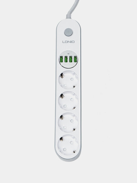 Длина кабеля 2 м Тип сетевой фильтр Максимальная нагрузка 2500 Вт Напряжение сети 250 В Номинальная сила тока 10 А Количество розеток 4 USB порт есть, 4 шт Функции заземление, выключатель на корпусе, шторки на розетке LDNIO - сетевой удлинитель на четыре розетки и с четырьмя разъемами USB. Относится к разряду вещей, которые необходимо иметь дома и на работе, с его помощью можно безопасно запитать электроприборы, а также максимально быстро зарядить аккумуляторы мобильных устройств или обеспечить работу гаджетов от разъема USB. Четыре USB разъема обладают интеллектуальной функцией определения характеристик аккумулятора у подключенных устройств, в зависимости от которых регулируется подача тока до 3.4А (макс). Данный факт обеспечивает эффективную и максимально быструю зарядку подключенных устройств. Снизу на сетевом удлинителе LDNIO SE4432 предусмотрены мягкие нескользящие накладки, которые придают устойчивости даже на гладкой, полированной поверхности, и защищают ее от появления царапин и мелких повреждений. Четыре евро розетки с заземлением, повернутые вокруг своей оси на 45 градусов, дают возможность одновременно запитать четыре электроприбора с суммарной, потребляемой мощностью до 2500 Вт при 10 А.