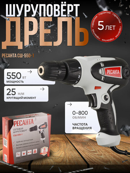 Сетевой шуруповерт Ресанта СШ-550-1: функциональность и удобство Сетевой шуруповерт Ресанта СШ-550-1 представляет собой функциональный электроинструмент, предназначенный для закручивания и откручивания шурупов, саморезов, винтов, дюбелей и других видов крепежных изделий. Он также может использоваться для сверления отверстий в различных материалах, что делает его незаменимым помощником как в быту, так и в промышленности. Шуруповерт работает от электросети 220-230В, что обеспечивает его стабильное и надежное функционирование. Потребляемая мощность составляет 550 Вт, а максимальный крутящий момент – 25 Нм. Особенности конструкции и функциональность Сетевой шуруповерт Ресанта СШ-550-1 оснащен быстрозажимным патроном, что обеспечивает удобство и быстроту смены насадок. Регулировка частоты вращения позволяет точно настроить скорость работы инструмента в зависимости от материала и задачи. Шуруповерт оснащен лампой точечной подсветки, которая обеспечивает хорошую видимость рабочей зоны даже при слабом освещении. Блокировка кнопки включения предотвращает случайное включение инструмента, что повышает безопасность работы. Сетевой шуруповерт Ресанта СШ-550-1 имеет компактные размеры (длина – 220 мм, ширина – 70 мм, высота – 200 мм) и небольшой вес (1,3 кг), что делает его удобным для транспортировки и хранения. Комплектация и гарантийный срок В комплект поставки входит сам сетевой шуруповерт, паспорт (инструкция) и упаковка. Гарантийный срок составляет 5 лет. Выбирая сетевой шуруповерт Ресанта СШ-550-1, вы получаете надежный и функциональный инструмент, который станет незаменимым помощником в быту и на производстве.
