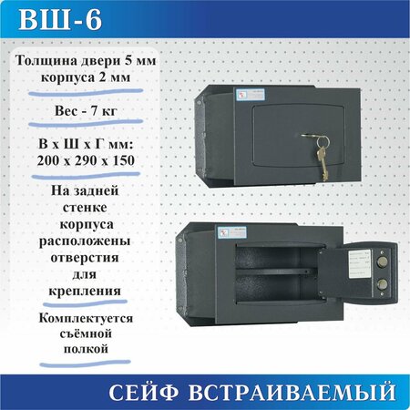 Сейф встраиваемый односекционный ВШ-6 предназначен для монтажа в стену. Дверь шкафа оснащена сейфовым замком сувальдного типа. Корпус сейфа толщиной 2 мм, лицевая панель и дверь толщиной 5 мм. На задней стенке корпуса расположены отверстия для крепления. Сейф оснащен съемной полкой. Соответствует требованием нормативных документов ГОСТ Р 55148-2012 (п. 4.1, табл. 1). Класс устойчивости к взлому S1. Цвет: Серый.