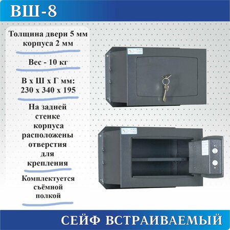 Сейф встраиваемый односекционный ВШ-8 предназначен для монтажа в стену. Дверь шкафа оснащена сейфовым замком сувальдного типа. Корпус сейфа толщиной 2 мм, лицевая панель и дверь толщиной 5 мм. На задней стенке корпуса расположены отверстия для крепления. Сейф оснащен съемной полкой. Соответствует требованием нормативных документов ГОСТ Р 55148-2012 (п. 4.1, табл. 1). Класс устойчивости к взлому S1. Цвет: Серый
