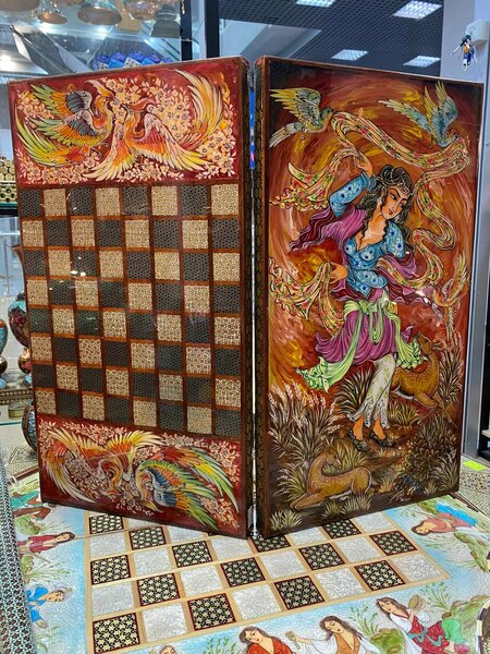 Шахматы\Нарды, Эксклюзивная Ручная работа, 50см*55 см, Иран. Нарды выполнены в технике Хатам (Хатам Кари, Хатам Банди), древней персидской технике инкрустаций по дереву. Основа может быть выполнена из различных пород дерева: апельсинового, бетеля, эбенового, ореха, кипариса, ююбы, сосны. Поверхность же покрывается редчайшим видом мозаики со сложным геометрическим узором в виде шестигранных треугольников. Узоры также бывают пяти-, восьми- и десятигранными, но именно шестигранники остаются наиболее популярными. Дополнительным материалом техники Хатам служит кость (верблюжья, слоновая и коровья), металлические нити (2 — 3 мм толщиной): медь, золото и серебро и перламутр. Премиальные нарды ручной работы зачастую украшаются традиционными персидскими миниатюрами, демонстрирующими Сцены Охоты, Игры в Поло, Образы прекрасных девушек. Миниатюры отличаются высоким уровнем проработки деталей и считается, что чем больше на предмете искусства выписано лиц, тем оно более ценно. Шахматы привнесут не только эстетическое удовольствие, но и послужат инструментом для развития тактического и стратегического мышления с восточным колоритом.