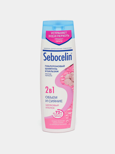 Гиалуроновый шампунь и бальзам-ополаскиватель для волос 2 в 1 против перхоти SEBOCELIN Шелковый хлопок Объем и сияние, 400 мл эффективно очищает волосы и кожу головы, уменьшает дискомфорт и зуд, придает объем от самых корней и сияние волосам, делая их пышными и послушными. pH-сбалансированная формула тройного действия подходит для ежедневного ухода за волосами всех типов. Активные ингредиенты: Пироктон оламин эффективно действует против перхоти, устраняет причину ее появления, обладает антимикробным действием. Гиалуроновая кислота обеспечивает увлажнение кожи головы и волос по всей длине на длительное время. Хлопок обеспечивает увлажняющий и кондиционирующий эффект. Протеины шелка образуют на поверхности кожи защитную пленку, сохраняющую влагу, придают волосам блеск и сияние.
