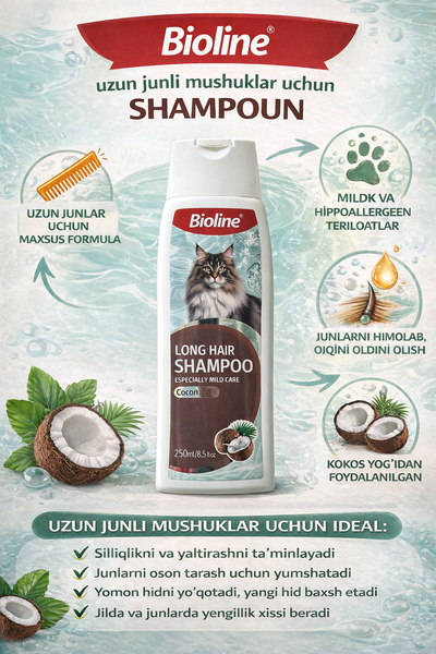 Шампунь Bioline Long Hair — это профессиональный шампунь, разработанный для кошек и собак с длинной шерстью. Он глубоко очищает шерсть, уменьшает спутывание и облегчает расчесывание. При регулярном использовании шерсть становится гладкой, мягкой и выглядит здоровой. Шампунь для длинных волос, облегчает расчесывание кошек Ключевые ингредиенты: вода, лауретсульфат натрия, кокамидопропилбетаин, кокамид ДЭА, пантенол, ароматизатор Кокос Шампунь для длинных волос, облегчает расчесывание кошек
