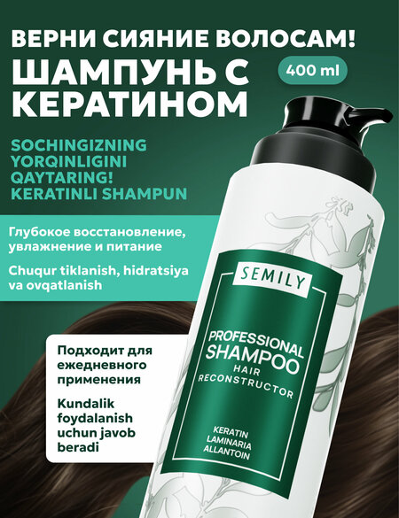 {"widgets":{"@card/UniversalPromoBadge":{"/content/page/fancyPage/defaultPage/universalPromoBadge":{"wrapperProps":{"margins":{"bottom":"3"}},"initialTime":1771441908670,"offerComposeId":"14690824840614164588"}}},"meta":{"/content/page/fancyPage/defaultPage/universalPromoBadge":{"name":"@card/UniversalPromoBadge"}},"collections":{"productServiceSnippets":{"14690824840614164588":{"productSnippet":{"snippetId":"document_id","type":"MODEL_CARD_LAYOUT","productPayload":{"snippetStyle":"NORMAL","title":{"value":"Шампунь для волос с кератином SEMILY, профессиональный - Зеленый"},"badges":{},"price":{"actualPrice":{"amount":{"intPart":92000,"currency":"UZS"},"style":"RED","type":"OTHER_DISCOUNT"},"oldPrice":{"amount":{"intPart":184000,"currency":"UZS"},"style":"STRIKETHROWED"}},"gallery":{"mediaItems":[{"picture":{"baseUrl":"https://avatars.mds.yandex.net/get-mpic/4078462/2a0000019be4ef3ecbcfed27221b10cb2401/","width":1231,"height":1600,"title":"Шампунь для волос с кератином SEMILY, профессиональный - Зеленый"},"type":"IMAGE"},{"picture":{"baseUrl":"https://avatars.mds.yandex.net/get-mpic/17751811/2a0000019be4ef3ecac7f94c503d9b47d8cd/","width":1200,"height":1600,"title":"Шампунь для волос с кератином SEMILY, профессиональный - Зеленый"},"type":"IMAGE"},{"picture":{"baseUrl":"https://avatars.mds.yandex.net/get-mpic/10637301/2a0000019be4f3d36fe2228e665b17c7e427/","width":1200,"height":1600,"title":"Шампунь для волос с кератином SEMILY, профессиональный - Зеленый"},"type":"IMAGE"},{"picture":{"baseUrl":"https://avatars.mds.yandex.net/get-mpic/18505141/2a0000019be4ef3ecc37fd9da5a5ee16d6e4/","width":1200,"height":1600,"title":"Шампунь для волос с кератином SEMILY, профессиональный - Зеленый"},"type":"IMAGE"},{"picture":{"baseUrl":"https://avatars.mds.yandex.net/get-mpic/17696795/2a0000019be4f4a8b64eca5e58a415315cd3/","width":1200,"height":1600,"title":"Шампунь для волос с кератином SEMILY, профессиональный - Зеленый"},"type":"IMAGE"}]},"wishlistButton":{"businessId":216624265,"mskuId":101824944748,"modelId":95710011,"oskuId":5051163023,"offerId":"0ugrwX8gJMO0m2DIvVtCDg"}},"baobabPayload":{"type":"offer","wareId":"0ugrwX8gJMO0m2DIvVtCDg","modelId":95710011,"marketSku":"101824944748","snippet_type":"product","isExpress":false,"price":184000,"additionalPrices":[{"priceType":"withDiscount","priceValue":92000},{"priceType":"unknown","priceValue":184000}],"hid":91183,"shopId":431782,"shopSku":"5982124","supplierId":216674881,"supplierType":3,"isUltima":false,"oskuId":5051163023,"snippetTheme":"GRID_FULL","stockCount":20,"promoLogJoinId":"936ab0389be9a898f1acfc52fdcb0f16/ab9c937662344391"},"themeType":"GRID_FULL"}}}}}