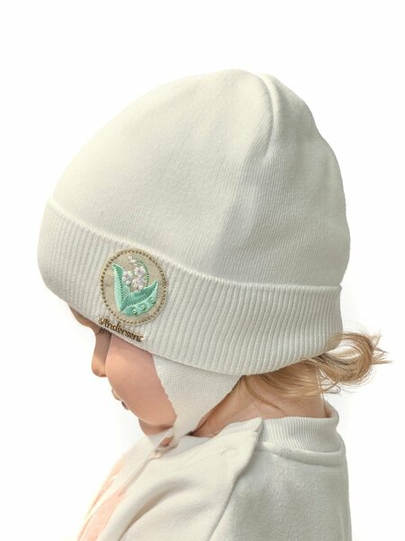 Шапка на подкладе, с кроеной макушкой, отворотом, притачными ушками и завязками. Декор: Патч "Цветы", шильд "Andersen".
