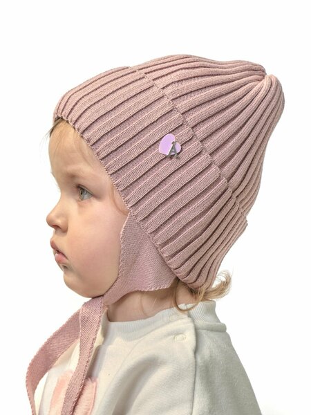 Шапка на подкладке, с макушкой на стяге, отворотом, притачными ушками и завязками. Вязка "лапша". Декор: "Сердце с буквой "А".