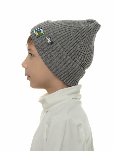 Шапка с отворотом, с макушкой на стяге. Вязка "лапша". Декор: значки "Самолет", "Карта".