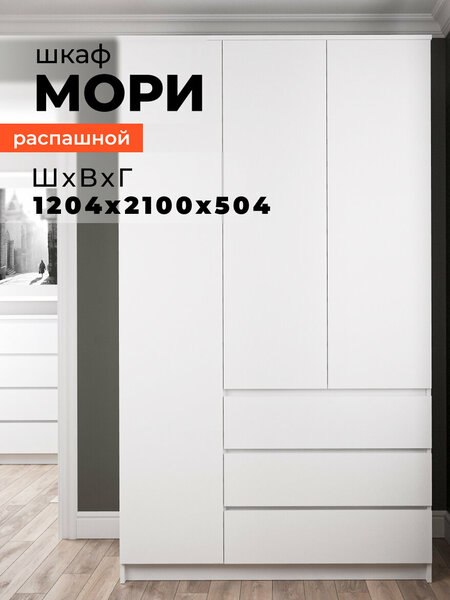 Шкаф напольный Мори МШ 1200.1 белый - это современное и функциональное решение для хранения вещей. Он выполнен в минималистическом стиле, что делает его подходящим для различных интерьеров. Корпус и фасады шкафа изготовлены из качественного ЛДСП белого цвета, что обеспечивает долговечность и устойчивость к повреждениям. Шкаф для одежды состоит из центральной части с широкими и глубокими полками и нижней части с тремя выдвижными ящиками на роликовых направляющих. Боковая часть оснащена полками и хромированной овальной штангой для вешалок. Особенностью шкафа является боковая створка, которая открывается при нажатии на нее. Это удобно и практично, так как не требуется дополнительное пространство для открывания дверей. Шкаф распашной без зеркала поставляется в разобранном виде, что облегчает его транспортировку и установку. В комплекте идет подробная инструкция по сборке. Материал фурнитуры - металл, что гарантирует прочность и надежность конструкции. Высота шкафа составляет 210 см, ширина - 120 см, глубина - 51 см. В нем предусмотрено 6 полок и 3 выдвижных ящика. Выбирая шкаф с ящиками Мори МШ 1200.1, вы получаете стильное, функциональное и надежное решение для хранения вещей в вашем доме.