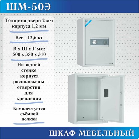 Шкаф мебельный односекционный ШМ-50Э предназначен для хранения бумажных документов. корпус шкафа толщиной 1,2 мм, дверь толщиной 2 мм. На задней стенке корпуса расположены отверстия для крепления; шкафы оснащены электронными замками серии ЕА; в комплектацию входят 2 аварийных мастер-ключа; цвет: серый.