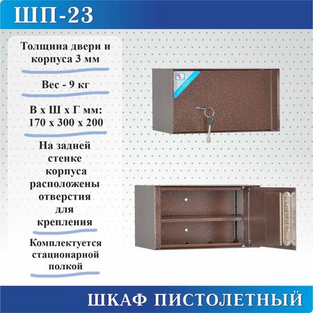 Шкаф пистолетный ШП-23 является усиленной модификацией шкафа ШП-2. Односекционный шкаф соответствует всем требованиям МВД России. Корпус шкафа толщиной 3 мм, дверь толщиной 3 мм. На задней стенке корпуса расположены отверстия для крепления. В двери установлен ключевой сувальдный замок ООО «Бордер» г. Рязань или аналогичный замок другого производителя. Цвет: Медь