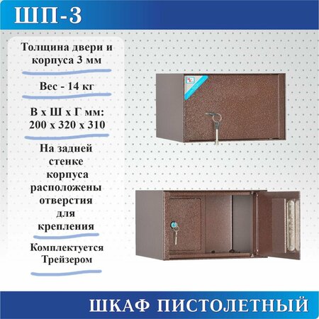 Односекционный шкаф соответствует всем требованиям МВД России. Корпус шкафа ШП-3 толщиной 3 мм, дверь толщиной 3 мм. На задней стенке корпуса расположены отверстия для крепления. Шкаф односекционный, оснащен отделением под патроны. В двери установлен ключевой сувальдный замок ООО «Бордер» г. Рязань или аналогичный замок другого производителя. Цвет: Медь