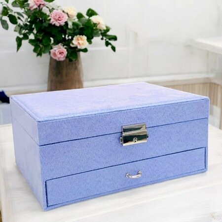 Двухярусная бархатная шкатулка для драгоценностей большой вместимости, шкатулка для хранения ювелирных изделий надежно закрывается на замок. Внутри несколько отделений для украшений - колец, сережек, брошек. Эта шкатулка для ювелирных украшений станет чудесным подарком для жены, любимой девушки, приятельницы или коллеги, подарок новый год, рождество, на 14 февраля, 8 марта, день рождения. Характеристики: Материал: искусственная бархат, картон, текстиль, вельвет, металл. Размер: 23*17*10,5см Вес: 1300 грамм. Замок с ключиком. Два уровня отделений для хранения. Цвет: темно-зеленый, темно-синий, пудровый розовый, сиреневый.