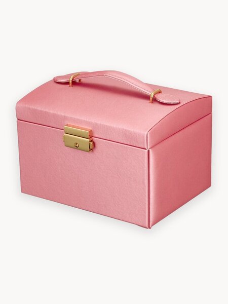 Шкатулка выполнена в форме чемоданчика. Откидная крышка надежно закрывается на замок. Внутри несколько отделений для украшений - колец, сережек, брошек. На внутренней стороне крышки прикреплено удобное зеркальце. Можно сразу же примерить понравившееся изделие и оценить, как оно сочетается с платьем или прической. И тут же попробовать другой вариант. Эта шкатулка для ювелирных украшений станет чудесным презентом для супруги, любимой девушки, приятельницы или коллеги. Характеристики: Материал: искусственная кожа PU, вельвет. Размер: 18*14*12см Вес: 725 грамм. Замок с ключиком. Три уровня отделений для хранения. Зеркальце для удобного использования. Цвет: Белый шелк, коралловый, розовый, бежевый.
