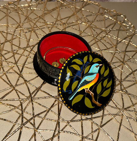 Эта изысканная шкатулка — настоящий арт-объект, созданный для хранения самых ценных мелочей. Глубокий чёрный фон подчёркивает яркую художественную роспись с изображением птицы среди листвы — символа гармонии, свободы и вдохновения. Каждый мазок наполнен характером и делает изделие по-настоящему уникальным. Внутренняя отделка насыщенного красного цвета создаёт эффект роскоши и бережно защищает украшения от царапин. Компактная, но вместительная, шкатулка идеально подойдёт для колец, серёг и других аксессуаров, сохраняя порядок и добавляя эстетическое удовольствие в повседневную жизнь. Прекрасный выбор для подарка — стильного, душевного и запоминающегося. Эта шкатулка станет акцентной деталью интерьера и подчеркнёт утончённый вкус своей владелицы.