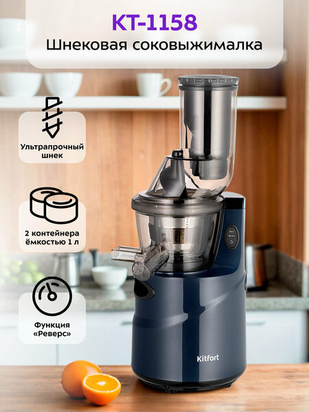КТ-1158 позволяет отжимать максимально возможное количество сока из фруктов, большинства овощей и зелени с сохранением их компонентов: витаминов, аминокислот и минералов. Корпус соковыжималки выполнен из прочного пластика, выдерживающего большие нагрузки. Шнековая соковыжималка отжимает сок так же быстро, как и традиционная центробежная. Спиралевидный шнек-пресс из ультрапрочного материала дробит и прессует продукт, а затем продавливает мякоть через фильтр, отделяя жмых от сока. КТ-1158 предусматривает систему «Стоп-капля». После процесса отжима, когда вы уберёте контейнер, капли сока ещё могут стекать на стол. Чтобы подобных проблем не было, на отверстии для выхода сока есть клапан, при опускании которого сок не будет вытекать. В случае загрязнения корпус легко очистить мягкой тканью или губкой. Для мытья фильтра в комплекте к соковыжималке прилагается щётка, помогающая вычистить остатки мякоти. Благодаря компактной конструкции соковыжималка не занимает много места на кухне. У соковыжималки KT-1158 одна скорость работы и функция «Реверс», которая помогает, если продукты застряли и мешают работе устройства: при включении реверса шнек начинает вращаться в обратном направлении, возвращая застрявшие части продуктов. Соковыжималка имеет полностью разборную конструкцию, что облегчает её уборку и хранение. Весь процесс приготовления сока происходит быстро благодаря продуманной форме шнека и отжимного блока, распределяющего в разные стороны сок и жмых.