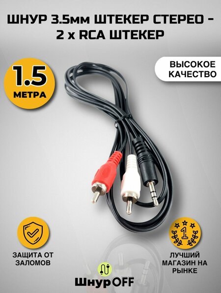 Шнур jack 3.5 мм стерео штекер - 2 RCA штекер предназначен для передачи аналогового аудиосигнала и широко применяется в акустических системах. Длина шнура составляет 1.5 метра.