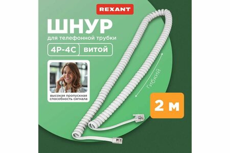 Шнур для телефонной трубки REXANT витой RJ-10 (4P-4C), 2 м, белый