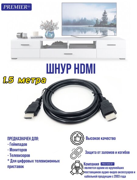 Шнур HDMI "шт" - HDMI "шт" пластик 1.5 метра. Не один десяток лет шнуры HDMI (High Definition Multimedia Inter Face) в переводе Мультимедийный интерфейс высокой четкости, пользуются большой популярностью благодаря своей доступности и передаче сигнала высокой четкости, что позволяет смотреть изображение на телевизоре в высоком качестве. Создатели кабеля HDMI не стоят на месте и выпускают все новые обновленные версии, такие как версия 1.4/ 2.1. На сегодняшний день самая актуальная версия 2.1. Шнуры HDMI предназначены для передачи цифрового сигнала в высоком разрешении 1080р, качество передачи на сегодняшний день самое лучшее, четкость изображения уникальна, качество звучания по цифровому сигналу удивительно. Длина кабеля 1.5 метра.