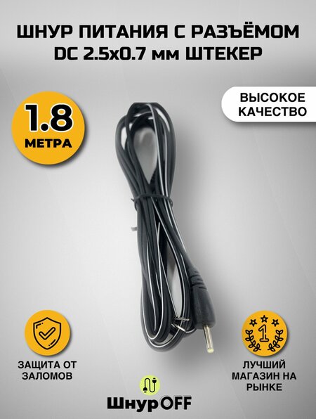 Шнур питания с разъемом DC 2.5x0.7 мм штекер (1.8 метра)