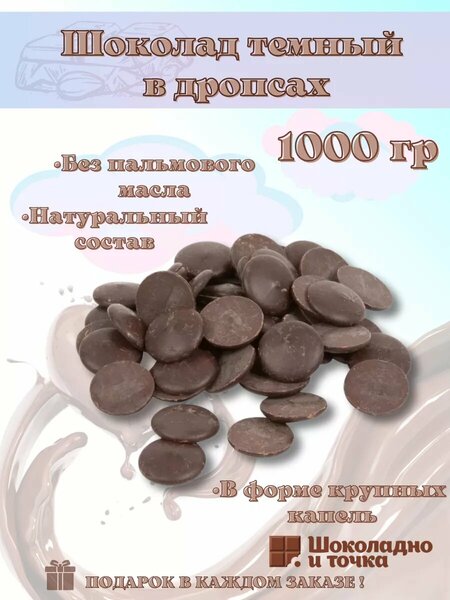 Подарок В каждом заказе! Темный шоколад в каллетах, дропсах с насыщенным вкусом. отлично подходит для ганашей и начинок с нежным сливочным вкусом, а также для отливки средних и больших полых фигур. Шоколад в виде каллет-удобно отмерять нужное количество, удобно плавить. Каллеты прекрасно темперируются и подходят для выпечки, в качестве добавок в тесто, для кексов, печенья, маффинов, а также для коктейлей, десертов и мороженого, в том числе для приготовления конфет и декорирования тортов. Темный шоколад в дропсах-является отличным подарком для кондитера! Темный кондитерский шоколад в крупных дропсах отличная покупка для кондитера и любого покупателя. В дропсах из нашего магазина используются только натуральные ингредиенты без добавления искусственных ароматизаторов и красителей. Правильное соотношение какао-масла дает оптимальную текучесть - 3 капли. Область применения темного шоколада самая разнообразная: для шоколадных плиток, муссов, начинок, корпусных конфет, ганаша, мороженого, фруктов в шоколаде, торта, шоколадного декора, для выпечки или просто к чаю. Шоколадные капли готовы к употреблению. Может содержать следы молочных продуктов, Орехов, карамели, кокоса, вафельной крошки, лактозы, глютена, пшеницы, мармелада. Противопоказано при не переносимости. Противопоказано при фенилкетунирии.