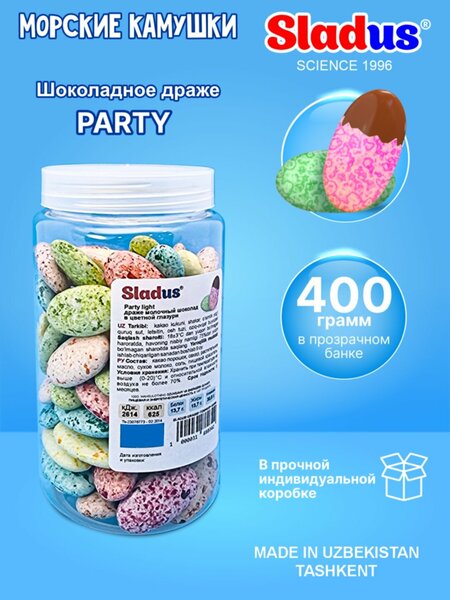 {"widgets":{"@light/ProductM2bEdoOnlyBadge":{"/content/page/fancyPage/defaultPage/m2bEdoOnlyBadge":{"wrapperProps":{"margins":{"top":"2"}},"isM2bEdoOnlyEnable":false}}},"meta":{"/content/page/fancyPage/defaultPage/m2bEdoOnlyBadge":{"name":"@light/ProductM2bEdoOnlyBadge"}},"collections":{"views":{"defaultOffer":"vi_16800511364861686757_bi_8038604332424517694"},"viewItem":{"vi_16800511364861686757_bi_8038604332424517694":{"id":"vi_16800511364861686757_bi_8038604332424517694","composeId":"16800511364861686757","buyOptionId":"bi_8038604332424517694"}},"buyOption":{"bi_8038604332424517694":{"id":"bi_8038604332424517694","title":"Драже шоколадное Sladus \"Party\", в форме морских камушков, 400г","offerId":"sMq8UOwMpq20UahPa59DQg","slug":"shokoladnoye-drazhe-sladus-party","trackingLinks":{"cpa":"/34A7tobMFb8fbXqxAnpwtfkVT0HM","promotionUrl":"/ojE7pkN7yoaJYV1g3aNpgI4la3wB"},"skuId":"103821182991","productId":"1091034723","categoryId":"15719820","navnodeId":"72172","departmentId":"54434","showUid":"17709292412350085414706001","counterStep":1,"minimum":1,"maximum":39,"price":{"value":42000,"currency":"UZS"},"vendorId":"44333310","feeShow":"OTNDnItfwRMlLJby2gHopVZsjmguRqTJplx_CF1RHZa_3cgTD3OvKrQARsEufNZWLTKSZFxTw9pib5tzgDOnRMUqlbWFeDfaOVa-YD5C2-t9DfYUAWRbHEmVb8JID7chaH-FC1XpYIkiRpUmZwrpxhqh6Jml2sznLSZC4Rg6YeQEz_bi1DFfyPRnqXt_FbVH37LwJIYyjrd7hAAFumzZ7Nqp2bbMvu6Zlwuo7IxOr6-GQk-WXwxoULNh-ld7VO0SgYt7boRteS2odYdURmGpEsZRtk7wSogPor0_Wc-MamD7xrM3OtF9Zw,,","feedId":"54589573","feedOfferId":"54589573.Party","shopId":"431782","supplierId":"209215837","businessId":"196851516","supplierName":"Sladus Market","businessName":"Sladus Market","hasAnySize":false,"hasAnyDelivery":true,"benefitTypeCode":"waremd5","basePrice":{"value":55000,"currency":"UZS"},"promos":[{"key":"-i0_5I7BGjbx0GX0PhHV3A","type":"empty-promo","shopPromoId":"cf_135724","anaplanId":"cf_135724","landingUrl":"https://market.yandex.ru/special/empty-promo-landing?shopPromoId=cf_135724"}],"flags":["isFby","isOnDemand"],"analytics":{"warehouseId":"311","paymentType":"ANY","paymentMethodTypes":["BY_CARD_ONLINE","BY_CARD_TO_COURIER","IN_CASH"],"deliveryOptions":[{"deliveryType":"delivery","fromDate":1771015641,"toDate":1771015641,"priceInfo":{"value":0,"currency":"UZS"}},{"deliveryType":"pickup","fromDate":1771015641,"toDate":1771015641,"priceInfo":{"value":0,"currency":"UZS"}},{"deliveryType":"pickup","fromDate":1771015641,"toDate":1771015641,"priceInfo":{"value":0,"currency":"UZS"}},{"deliveryType":"delivery","fromDate":1771015641,"toDate":1771015641,"priceInfo":{"value":0,"currency":"UZS"}}],"shopSku":"Party","placementType":"3P","ownMarketPlace":true,"shopSlug":"yandex-market","yandexBnplInfo":{"enabled":true},"promos":[{"key":"-i0_5I7BGjbx0GX0PhHV3A","type":"empty-promo","shopPromoId":"cf_135724","landingUrl":"https://market.yandex.ru/special/empty-promo-landing?shopPromoId=cf_135724","isPersonal":false,"description":"Новые_акции_для_лендингов_полок_УЗБ_к_столу_1201"}],"hypeBadge":{"hasBadgeRare":false}},"deliveryType":"DELIVERY","imageMeta":{"namespace":"mpic","groupId":11930023,"key":"2a000001959fd0cfb9b98bfb7c1e476fb5ba"}}}}}