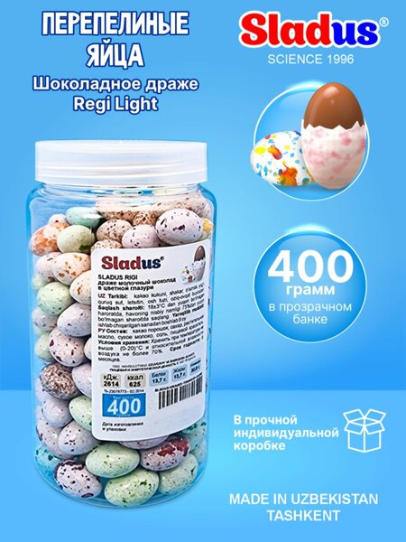 Шоколадное перепелиное яйцо «Regi light» Цветные драже – это красочное настроение, которое состоит из всех цветов радуги и любимым всеми шоколадного вкуса. Порадуйте себя и близких этими вкуснейшими лакомствами. Эти сладкие драже круглой формы из молочного шоколада, которые покрытые хрустящей разноцветной глазурью. Благодаря глянцевому покрытию, шоколадные драже имеют аппетитный блеск. Шоколадное перепелиное яйцо – изысканное лакомство, созданное для истинных ценителей качественного шоколада. Оно выполнено в форме перепелиного яйца с высокой детализацией, имитирующей натуральный вид: тонкая оболочка с нежным мраморным узором, в точности повторяющим рисунок настоящих перепелиных яиц. Это изделие изготавливается из премиального шоколада – молочного, темного или белого, что позволяет выбрать вкус на любой вкус. Внутри может находиться сюрприз: начинка из нежного крема, орехов, карамели или фруктового пюре, которая добавляет изделию неповторимый шарм. Идеально подходит в качестве оригинального подарка на праздник или дополнения к чайной церемонии. Красивое оформление и компактный размер делают эти яйца отличным выбором для праздничных столов, подарочных наборов или детских сладостей. Особенности: Натуральные ингредиенты высшего качества Элегантный и реалистичный дизайн Разнообразие вкусов и начинок Идеальный подарок для гурманов и любителей шоколада От производителя «Sladus» Размер: 2 см в длину, Вес: около 2-3 граммов Упаковка: индивидуальная или набор в стильной коробке Подарите себе или близким капельку радости и удовольствия с этими восхитительными шоколадными перепелиными яйцами! Условия хранения Хранить при температуре не выше 18±3°С и относительной влажности воздуха не более 75%. Состав Какао порошок, сахар, растительное масло, сухое молоко, соль, пищевой краситель. Хранить при температуре не выше 18±3°С и относительной влажности воздуха не более 75%. Пищевая и энергетическая ценность в 100г продукта: белки - 3.4, жиры - 23.9, углеводы - 70.3, кКал - 491, кДж 2054. Аллергены: Может содержать молоко и сою.
