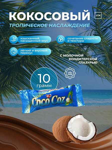 Шоколадный батончик "COCO COZ" от Торен - это сочетание нежного шоколада и кокосовой начинки в компактном формате. Нежный шоколад: Батончик "COCO COZ" изготовлен из качественного шоколада, который тает во рту и оставляет приятное послевкусие. Кокосовая начинка: Начинка из кокоса добавляет особый вкус и аромат, делая батончик еще более привлекательным для любителей кокоса. Компактный формат: Вес каждого батончика составляет всего 10 грамм, что делает его удобным для перекуса в любое время и в любом месте. Выбирая шоколадный батончик "COCO COZ" от Торен, вы получаете не только вкусный и питательный перекус, но и удовольствие от нежного шоколада с кокосовой начинкой в компактном формате.