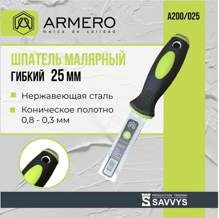 Шпатель Armero А200/025 имеет гибкое полотно из полированной нержавеющей стали, стальной наконечник-молоток и мягкую двухкомпонентную эргономичную рукоятку. Ширина полотна 25мм. Используется для нанесения и распределения строительной смеси на обрабатываемую поверхность. Благодаря гибкому коническому лезвию (толщиной 0.9 мм – 0.4 мм) из инструмент отличается гибкостью и эластичностью. Шпатель гарантирует аккуратное и качественное выполнение финишных шпаклевочных работ.