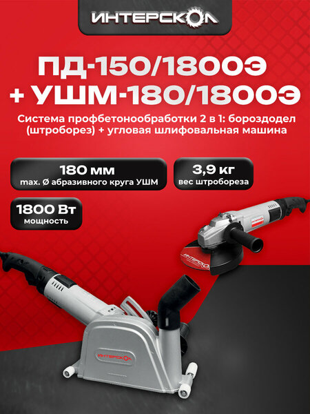 ИНТЕРСКОЛ представляет систему 2 в 1 - профессиональные бороздоделы ПД-125/1800Э+УШМ-150/1800Э арт.717.1.0.70 и ПД-150/1800Э+УШМ-180/1800Э арт.718.1.0.70, выполненные на базе унифицированного моторного блока с инновационным двухступенчатым редуктором. Для переоснащения бороздоделов в УШМ необходимо снять унифицированный моторный блок с кожуха штробореза и установить на него комплектный кожух для УШМ. Двухступенчатый редуктор позволяет уменьшить технологические зазоры, что улучшает передачу момента и снижает износ зубчатых колес редуктора, продлевая его срок службы. Унифицированный моторный блок выполнен на базе двигателя ИНТЕРСКОЛ серии ВС и оснащен константной электроникой с тахогенератором (магнитный датчик оборотов) – он ограничивает обороты холостого хода, поддерживая их под нагрузкой, что позволяет увеличить полезную мощность до 25% без изменения массогабаритных показателей двигателя. Конструкция бороздодела позволяет легко и быстро выполнять штробы, ролики на кожухе позволяют вести машину по поверхности ровно и уверенно. Ширина штробы регулируется дистанционными шайбами, а глубина – узлом регулировки вылета дисков. Узел пылеудаления использует кинетическую энергию частиц для направления их в патрубок пылеотвода – это позволяет повысить эффективность работы системы пылеудаления. Диаметр пылеотвода стандартизован по системе 35, что соответствует присоединительному диаметру на шлангах пылесосов ИНТЕРСКОЛ. Увеличенный срок службы, повышенный момент и пониженный уровень шума благодаря инновационному двухступенчатому редуктору; бронирование обмоток статора и ротора защищают двигатель от разрушительного воздействия пыли и шлама; специальный высокопроизводительный двигатель серии ВС для работы в продолжительном режиме; полиэфирный компаунд класса “H” позволяет эксплуатировать двигатель при температуре до 180 градусов и повышает перегрузочную способность на 15%; константный электронный блок обеспечивает повышенную надежность и защиту оператора: ограничение оборотов холостого хода; поддержание оборотов под нагрузкой; плавный пуск и ограничение пускового тока; быстрое изменение глубины реза без дополнительных инструментов; простая регулировка ширины штробы с помощью дистанционных шайб; эффективное пылеудаление благодаря оптимизированной конструкции узла пылеотвода на кожухе; адаптер для подключения шланга пылесосов ИНТЕРСКОЛ или других пылесосов с системой 35 (диаметр присоединительного патрубка на шланге пылесоса) для эффективного пылеудаления; фиксация шпинделя для легкой смены оснастки; лабиринтное уплотнение шпинделя, обеспечивающее дополнительную пылезащиту; обрезиненный корпус основной рукоятки облегчает удержание машины; крышки для быстрой замены щеток без разборки корпуса унифицированного моторного блока облегчают обслуживание.