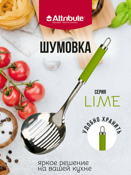 Шумовка LIME - удобное и практичное решение для повседневного использования. Шумовка изготовлена из высококачественной нержавеющей стали. Функциональная форма позволяет легко подчерпнуть содержимое. Особая конструкция отверстий быстро и эффективно сливают жидкость. Эргономичная ручка с покрытием soft-touch не нагревается и оснащена кольцом для практичного хранения на кухне. Линейка аксессуаров для приготовления пищи LIME - яркое и стильное решение для Вашего дома. Изделие можно использовать в посудомоечной машине.