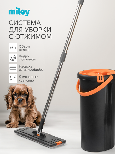 Швабра Miley "Light Mop", с отжимом, с ведром, микрофибра, плоская, оранжевая, чёрная