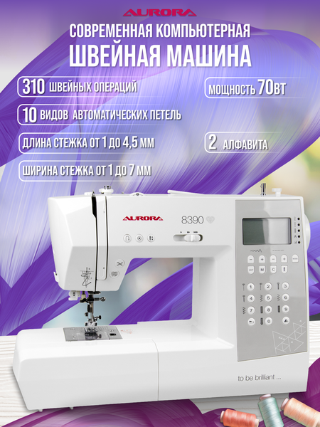 Швейная машина AURORA 8390 - это современная и функциональная швейная машина, которая станет незаменимым помощником в вашем доме. Одной из ключевых особенностей данной модели является компьютерное управление, что обеспечивает удобство и точность работы. Тип челнока - ротационный горизонтальный, что гарантирует плавность и бесшумность работы. Потребляемая мощность составляет всего 70 Вт, что делает машину экономичной в использовании. Швейная машина AURORA 8390 оснащена 310 различными швейными операциями, включая выполнение петли в автоматическом режиме. Это позволяет вам создавать разнообразные изделия, от простых до самых сложных. Модель оснащена двойной иглой, что позволяет выполнять две строчки одновременно. Это значительно ускоряет процесс работы и делает его более удобным. Швейная машина AURORA 8390 также оснащена рядом дополнительных функций, которые облегчат вашу работу. Среди них автоматическая остановка иглы в верхнем положении, автоматический обрезатель нити и автоматическое закрепление строчки. В комплект поставки входят различные лапки, такие как для вшивания молнии, пришивания пуговиц, обметочная и прозрачная. Это позволяет вам сразу приступить к работе и не тратить время на поиск дополнительных аксессуаров. Швейная машина AURORA 8390 имеет плавное регулирование скорости шитья, что позволяет вам контролировать процесс и получать наилучший результат. Устройство оснащено дисплеем, нитевдевателем, отсеком для аксессуаров и подсветкой, что делает работу с ним удобной и комфортной. Швейная машина AURORA 8390 имеет максимальную длину стежка 4,5 мм и максимальную ширину строчки 7 мм. Это позволяет создавать качественные и аккуратные швы на различных тканях. Вес швейной машины составляет всего 7 кг, что делает ее легкой и удобной для перемещения по рабочей поверхности. В комплект поставки входят все необходимые аксессуары, включая набор ниток и шпулек, держатель катушки, дополнительный катушечный стержень, вспарыватель, щёточку для чистки, набор игл, большую и малую отвёртки, фетровую прокладку и педаль. Выбирая швейную машину AURORA 8390, вы получаете надежный, функциональный и удобный инструмент для создания разнообразных изделий.