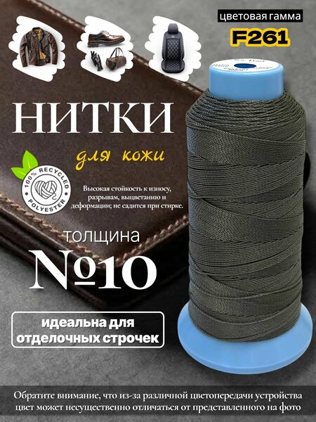 Сверхпрочная нить №10 высокого качества. Позволяет создавать аккуратные декоративные швы. Изготовлена из 100% полиэстера, представляет собой три скрученные между собой нити (840D/3). Благодаря своей конструкции и прочности по отношению к объему является швейной нитью повышенной надежности. Она обладает исключительной устойчивостью к истиранию. Область применения: * Изделия из кожи; * Обувь; * Сумки, чемоданы; * Обивка автомобильных сидений / авточехлы; * Отделка салона автомобилей; * Мебель; Преимущества: * Устойчивость к истиранию, высоким температурам, ультрафиолетовому излучению (не выцветает), усадке, атмосферным факторам; * Прочность – материал не деформируется при натяжениях; * Не боится гниения, действия микроорганизмов, грибка; * Стойкость к химическим веществам; Характеристики: * Состав - 100% полиэстер; * Линейная плотность - 270 Tex; * Намотка - 300 метров; * Рекомендуемые иглы №180-200; Обратите внимание! Цвет ниток может незначительно отличаться от представленных на фото из-за различной цветопередачи используемого устройства.