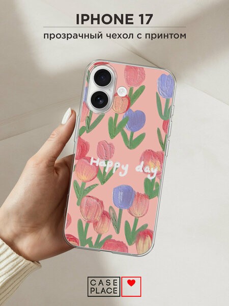 Чехол из плотного силикона на Айфон 17 с матовым текстурным принтом от Case Place. Принт на лицевой поверхности чехла — это не наклейка или плёнка. Мы печатаем рисунки на специальном принтере гибкими чернилами по технологии ультрафиолетовой печати — это значит, что они стойкие к истиранию и не выцветают со временем. Рисунок Happy Day будет оставаться ярким и четким сезон за сезоном. Перед отправкой заказа мы еще раз тщательно проверяем, хорошо ли пропечатался принт на каждом чехле, и только потом передаем заказ службе доставки. Чехол может пахнуть краской, ведь мы отправляем его вам сразу после печати рисунка. Не волнуйтесь, запах пропадет через несколько дней. При необходимости чехол можно мыть с мылом или протирать влажной салфеткой — рекомендуем бесспиртовой, чтобы не стереть принт. Специальные отверстия на бортике идеально подойдут для шнурка, брелока или карабина. Кейс на Apple iPhone 17 плотно прилегает к устройству, легко надевается и снимается. Так как принт нанесен только на лицевую поверхность защитного чехла, бортики остаются прозрачными, поэтому чехол не будет скользить в руках. Вы сможете свободно пользоваться как обычной, так и беспроводной зарядкой даже с технологией MagSafe, не снимая чехла со смартфона. Бампер на Айфон 17 не поднимает защитную пленку или стекло, если они установлены с отступами от краев экрана. Силиконовая накладка с принтом — это отличный подарок друзьям, коллегам, девушке, парню, сестре, брату на разные праздники: 14 февраля, 8 марта, 23 февраля, день рождения.