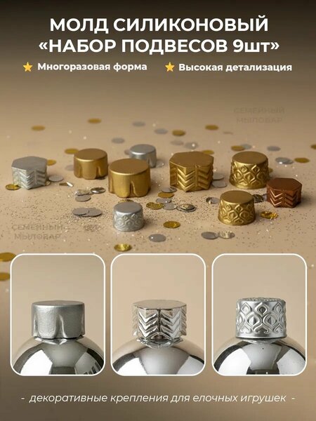 Силиконовая форма из пищевого силикона в виде подвесов для елочной игрушки - идеальный помощник для творческих людей! Молд на Новый Год с пищевым допуском из силикона можно использовать для: изготовления шоколадок, создания предметов интерьера, отливки мыла, свечей и многое другое. Силиконовая форма елочных креплений подойдёт для шоколада, гипса, воска, мыла, эпоскидной смолы и других пищевых и непищевых продуктов. Вы можете не ограничивать себя в творческом порыве, ведь форма новогодних креплений для игрушек многоразовая, а значит её остаточно очистить и можно использовать неоднократно! Выбирайте интересный дизайн, подходящие материалы и претворяйте ваши творческие задумки в жизнь вместе с силиконовым молдом! Обьем молда (всех 9 подвесов) - 7мл (возможна небольшая погрешность).