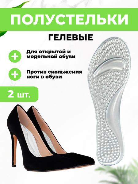 Силиконовые стельки — это превосходное решение для тех, кто желает чувствовать себя комфортно и уверенно даже в самой неудобной и жесткой обуви. Поверхность гелевых вставок имеет клейкую основу, поэтому обеспечивает надежный контакт стопы с обувью. Они надежно фиксируют стопу в обуви, поддерживают свод стопы в правильном положении. Наличие подушечки в районе продольного свода стопы предотвращает развитие осложнений плоскостопия и является профилактикой этой патологии. Пупырчатая поверхность полустелек обеспечивает легкое массажное воздействие. Благодаря этому происходит незаметная, но постоянная стимуляция активных точек стопы. В результате улучшается кровообращение в ступнях ног, нормализуется тонус всего организма, ведь на подошвах ног сосредоточены точки, «ответственные» за все части тела. При первых же часах ношения вы почувствуете облегчение - избавитесь от болей и жжения в передней части стопы, усталость в ногах уйдет. Обратите внимание, что эти полустельки приклеиваются от пятки и не доходят до носочной части обуви: тем самым поддерживают стопы не касаясь Ваших пальчиков. Не откладывайте заботу о своем здоровье на потом! Приобретите полустельки в нашем магазине QuisLife прямо сейчас и почувствуйте разницу с первых шагов.